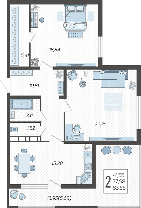 - Жилая площадь 41.55 м²