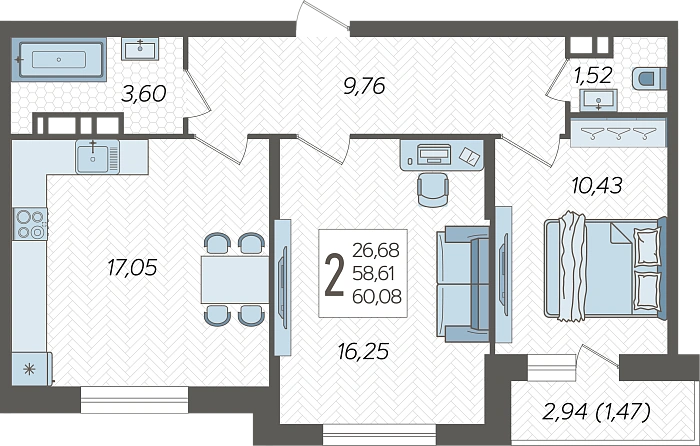 - Общая площадь 60.08 м²