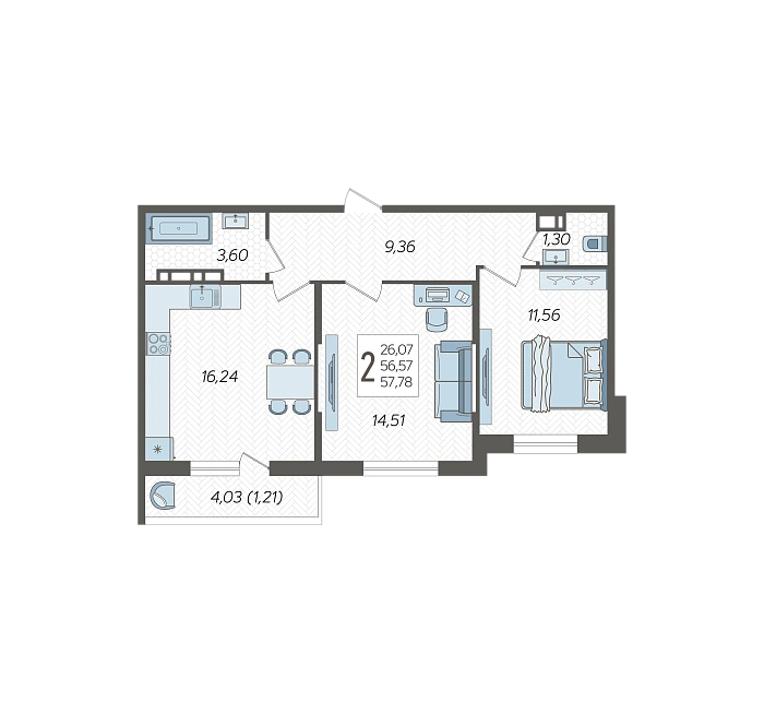 - Общая площадь 57.78 м²