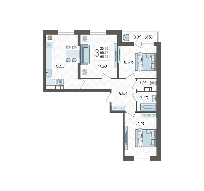 3-комнатная квартира №93, 68.22 м²
